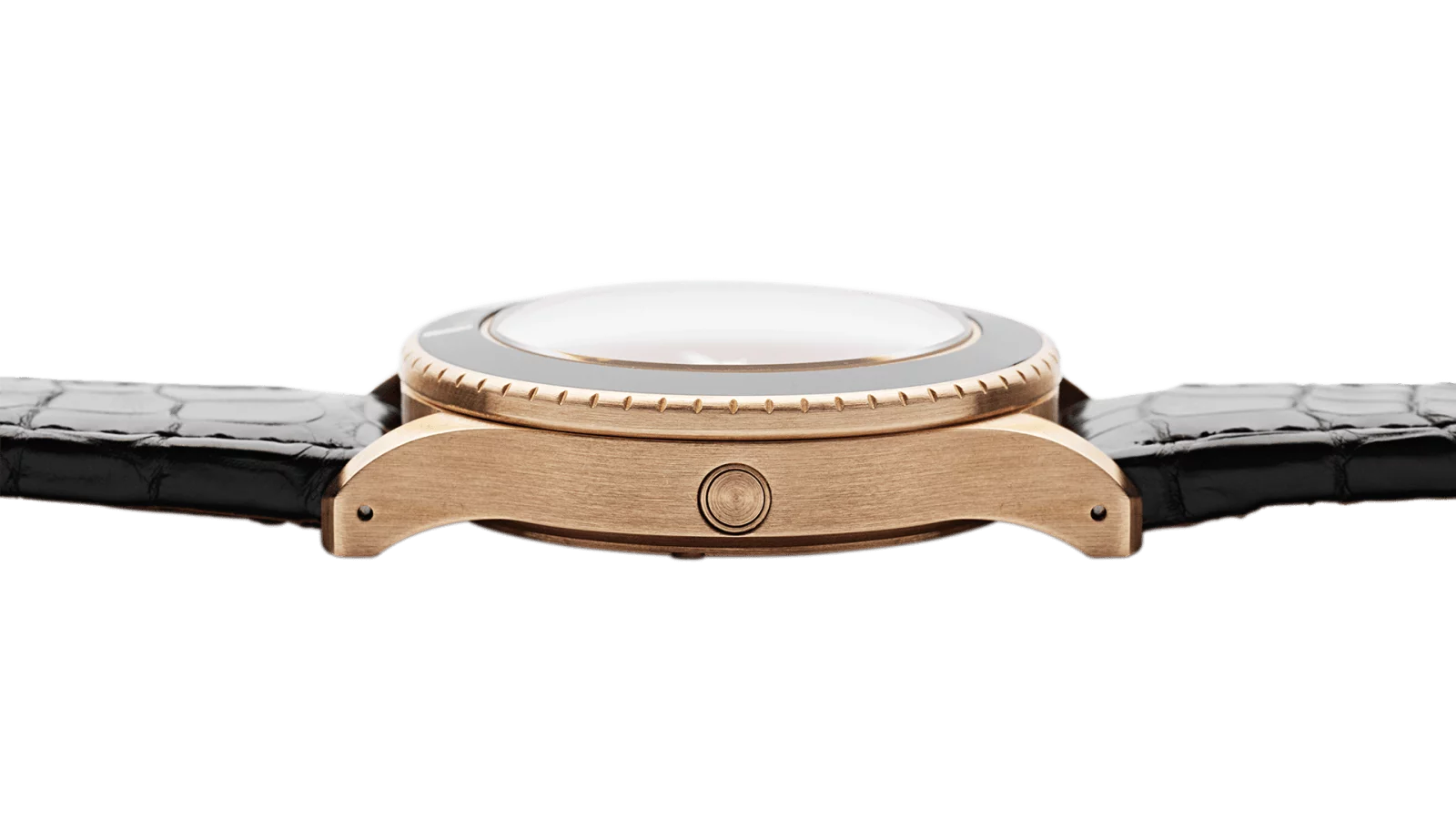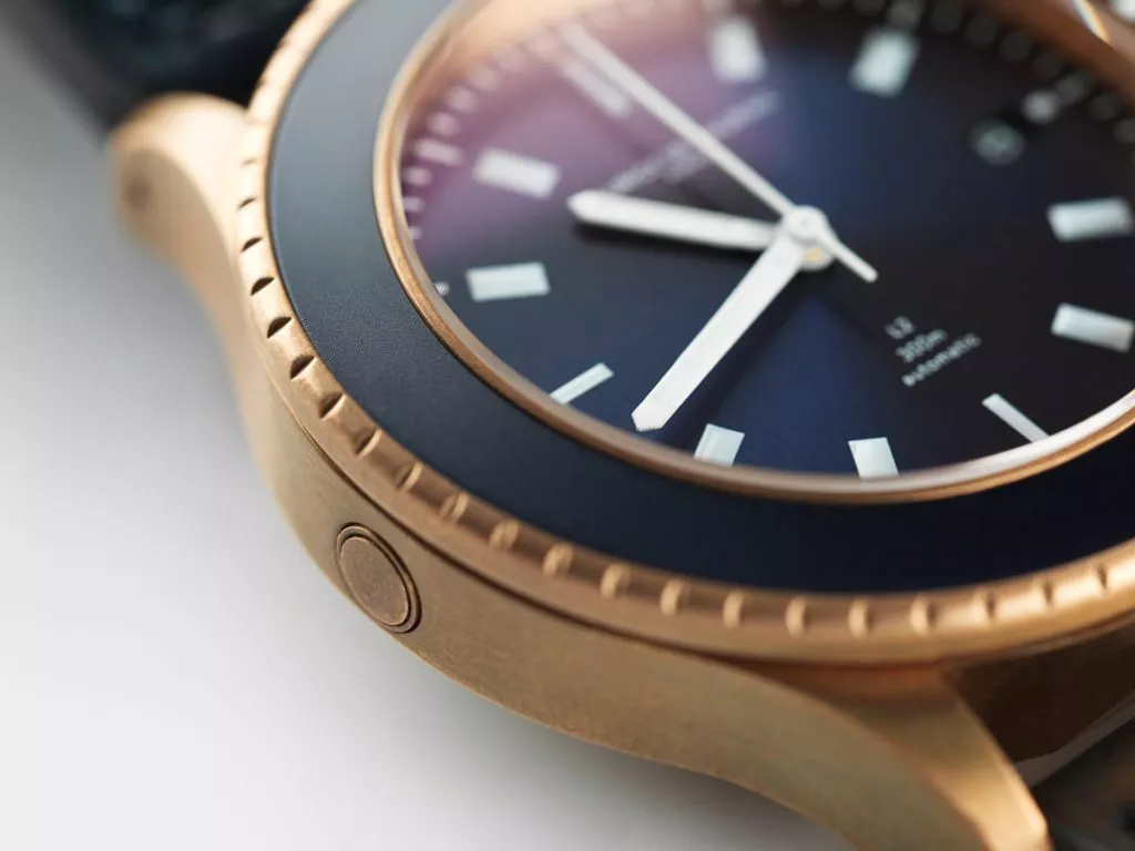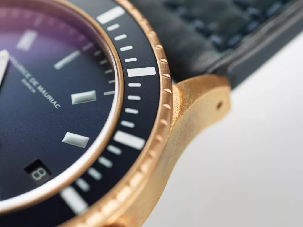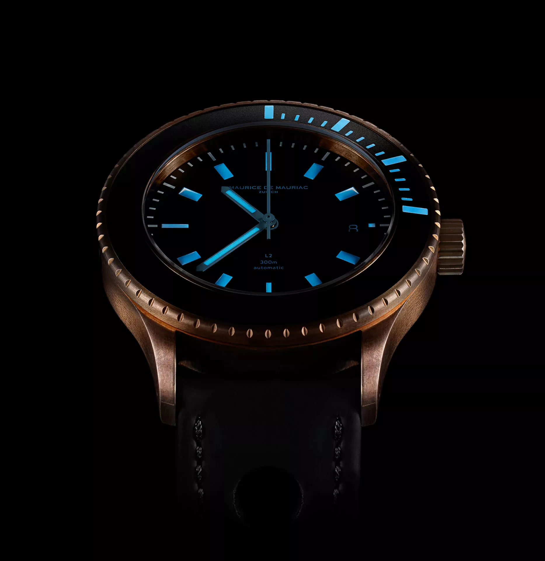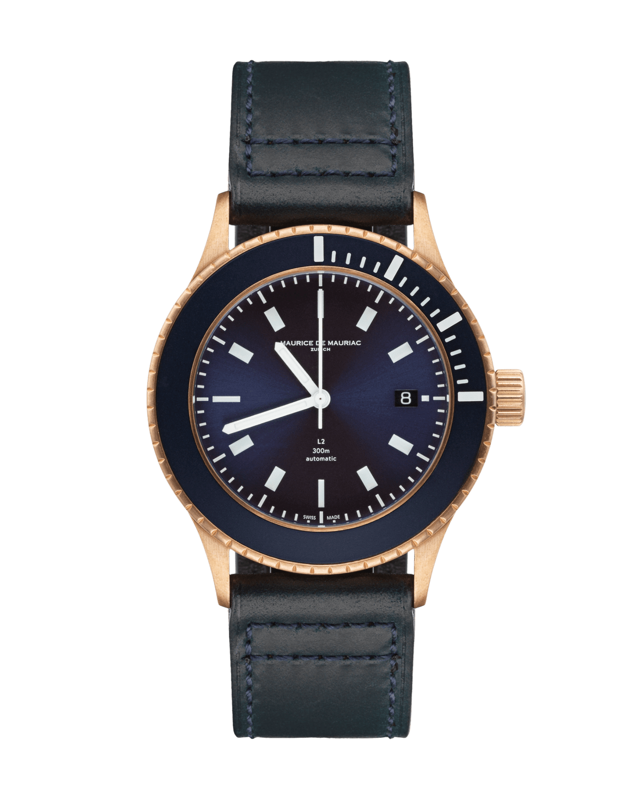 “Die L2 deep black in bronze ist die Ikone einer Taucheruhr. Das Meisterwerk des Schweizer Designers Fabian Schwaerzler und des Uhren- und Farbfetischisten Daniel Dreifuss, der Energie hinter Mauriac de Mauriac. Es dauerte viele Tage, Wochen und Monate, bis Daniel Dreifuss ja zu einer weiteren Farbe für die L2 gesagt hat. Zum Blau des neuen Zifferblattes und der neuen Lunette.”