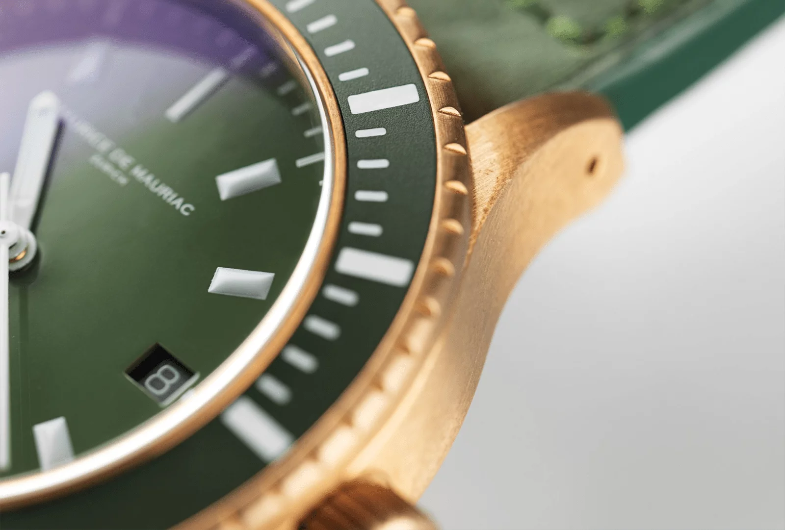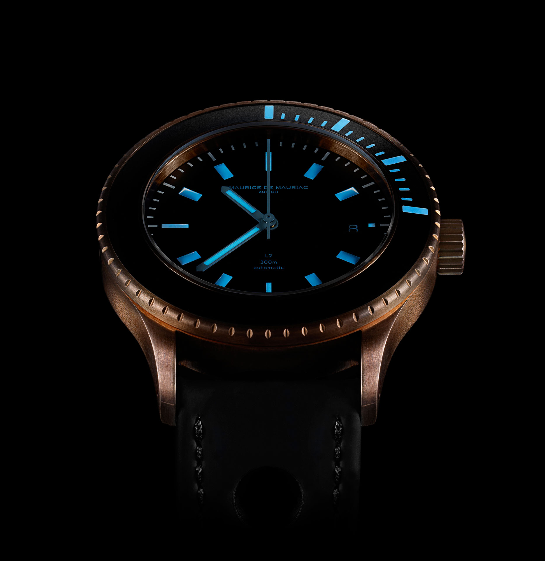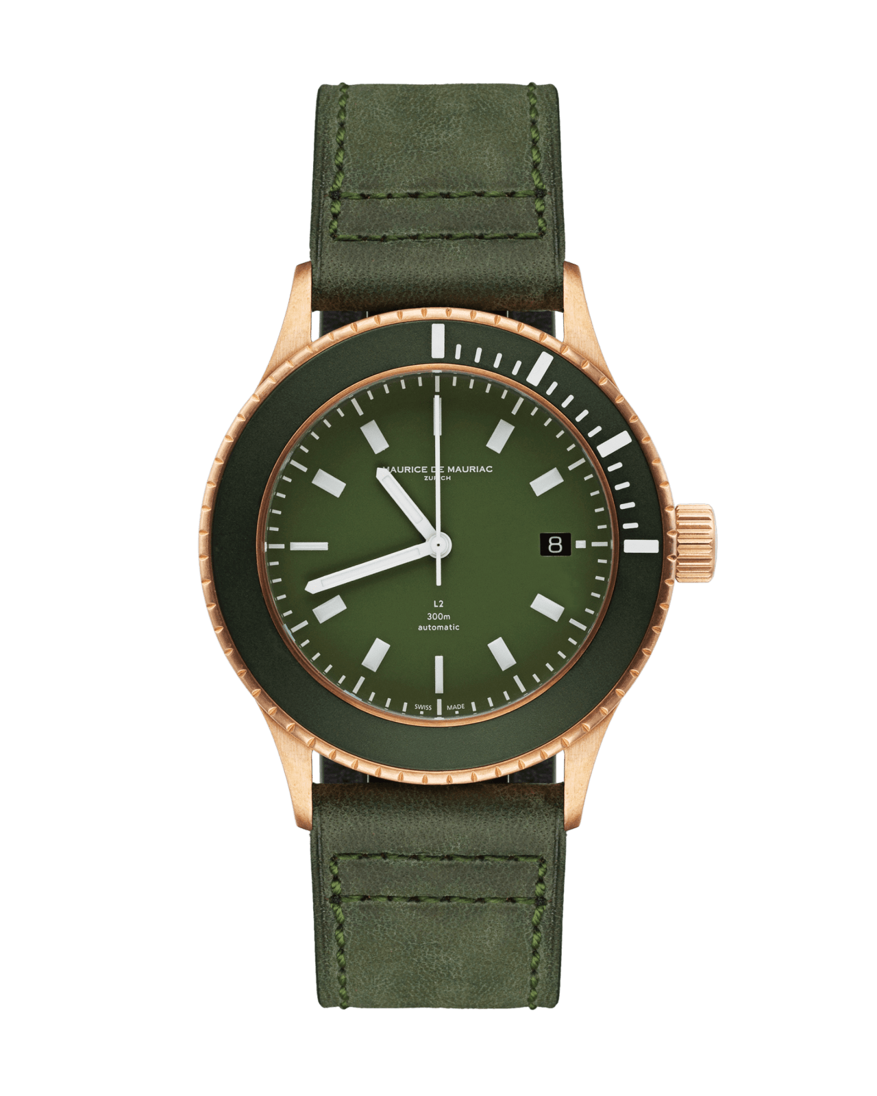 “Die L2 ist eine ikonographische Taucheruhr, ein Masterpiece der Kooperation zwischen dem Schweizer Designer Fabian Schwaerzler und Maurice de Mauriac. Sie holt in der deep green Version das Grün ins Leben, in dem wir so gerne sind, das uns atmen lässt und für Natur und Freiheit steht.”