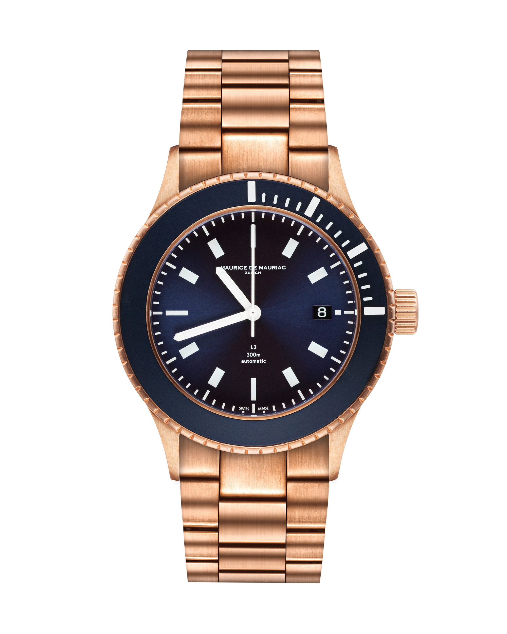 “Die L2 deep black in bronze ist die Ikone einer Taucheruhr. Das Meisterwerk des Schweizer Designers Fabian Schwaerzler und des Uhren- und Farbfetischisten Daniel Dreifuss, der Energie hinter Mauriac de Mauriac. Es dauerte viele Tage, Wochen und Monate, bis Daniel Dreifuss ja zu einer weiteren Farbe für die L2 gesagt hat. Zum Blau des neuen Zifferblattes und der neuen Lunette.”