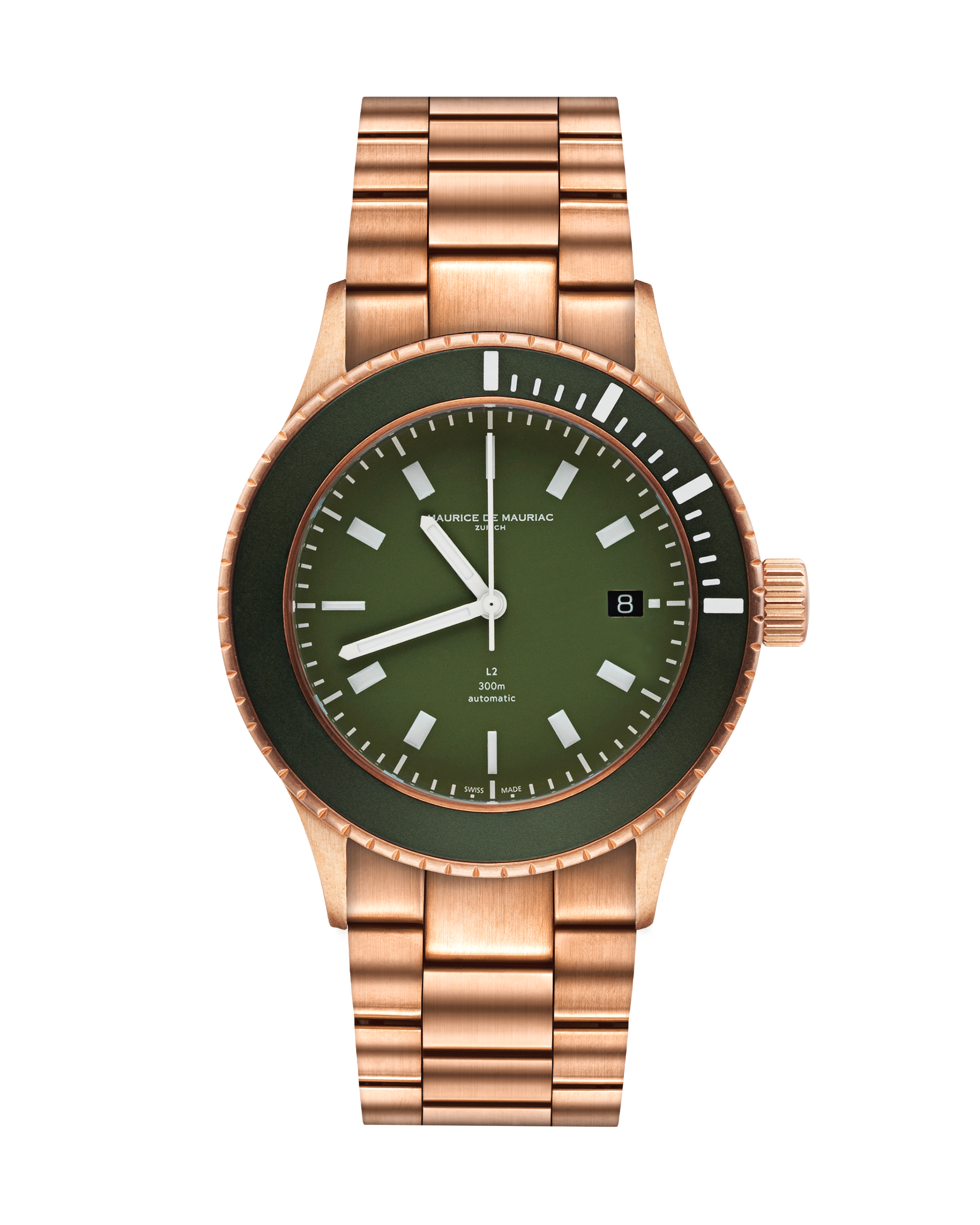“Die L2 ist eine ikonographische Taucheruhr, ein Masterpiece der Kooperation zwischen dem Schweizer Designer Fabian Schwaerzler und Maurice de Mauriac. Sie holt in der deep green Version das Grün ins Leben, in dem wir so gerne sind, das uns atmen lässt und für Natur und Freiheit steht.”
