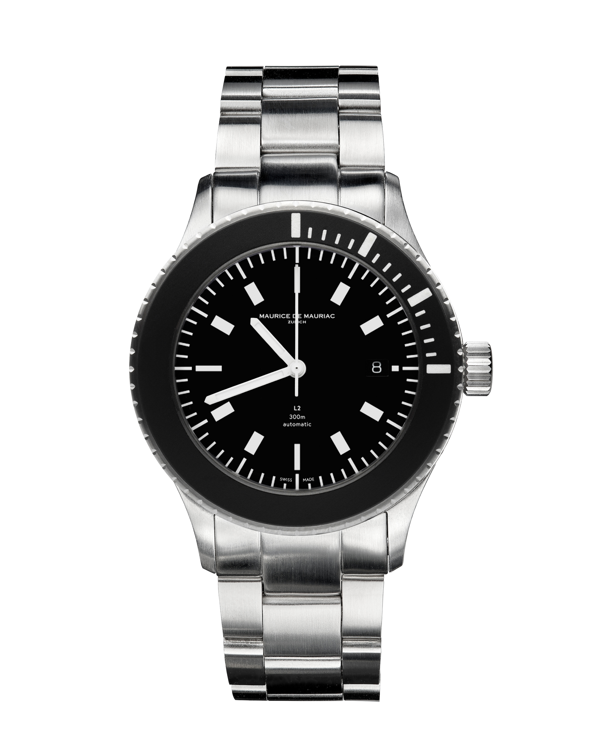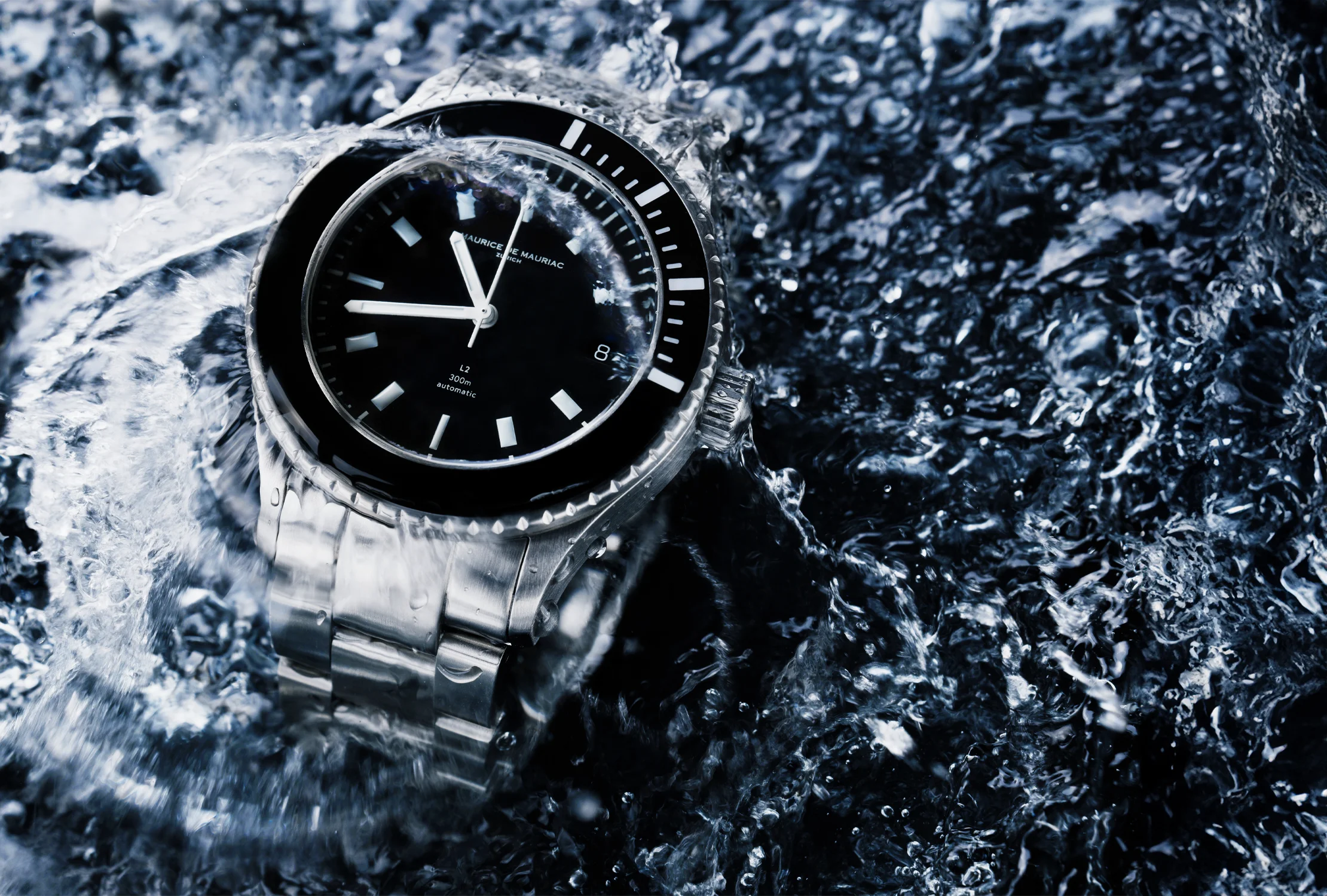“Maurice de Mauriac hat jahrelang in die Entwicklung und Herstellung von professionellen Taucheruhren investiert. Dieser L2-Stil ist aus 316L-Edelstahl gefertigt – einem der härtesten und widerstandsfähigsten der Welt – und mit einem Heliumventil ausgestattet, das den Überdruck beim Tauchen unter 300 Metern abbaut. Er verfügt über große Leuchtindizes und ein ETA 28.24 Uhrwerk, das sich bestens bewährt hat.”