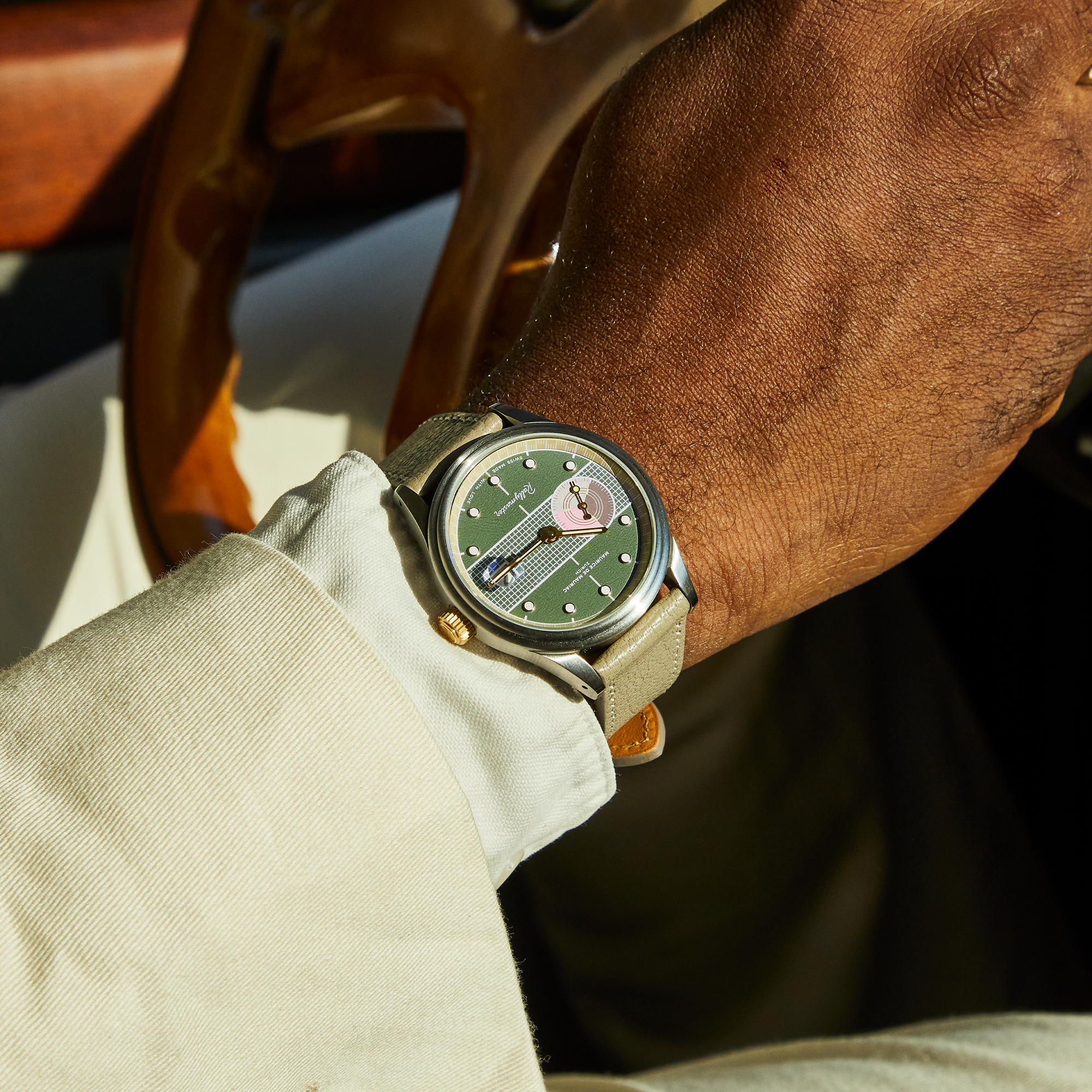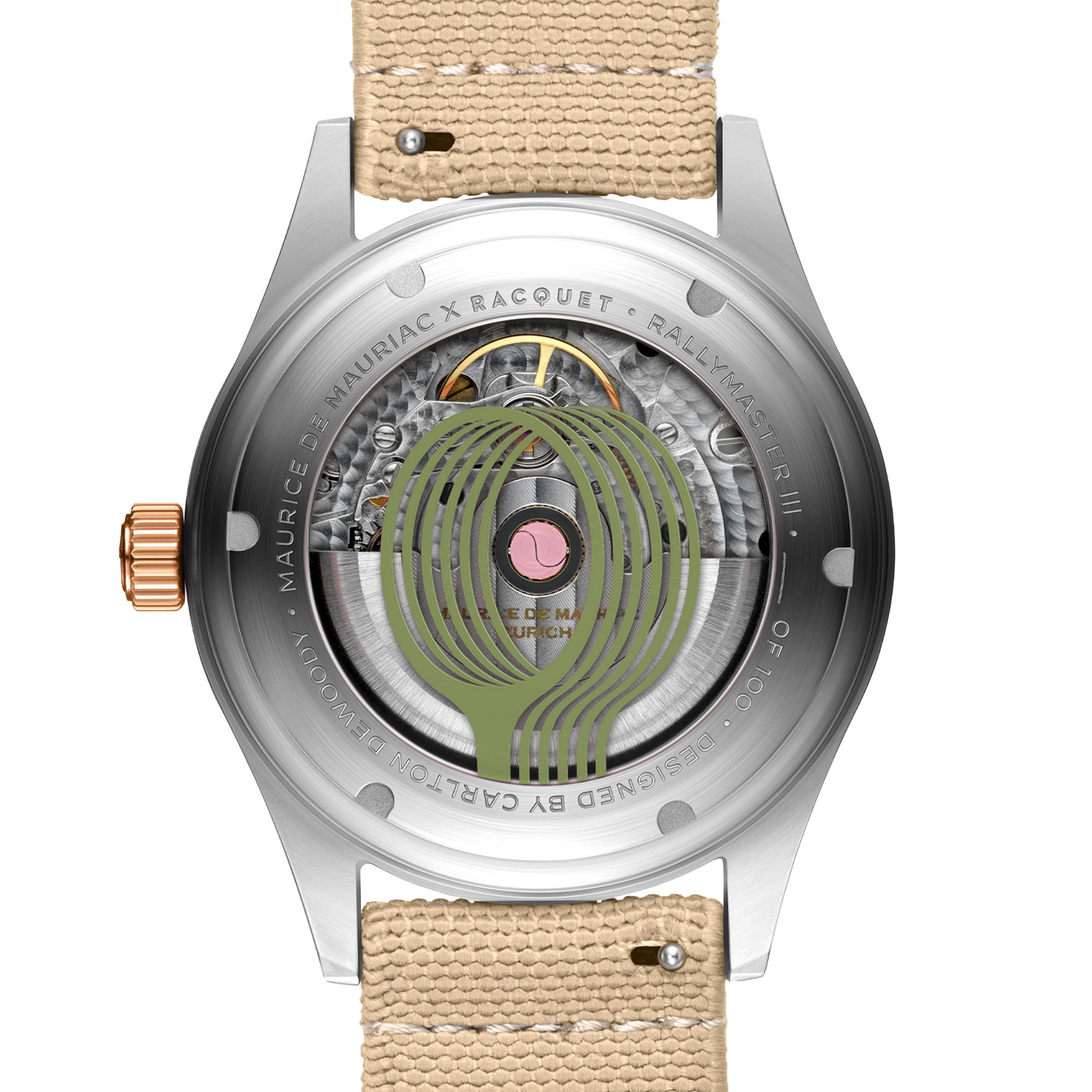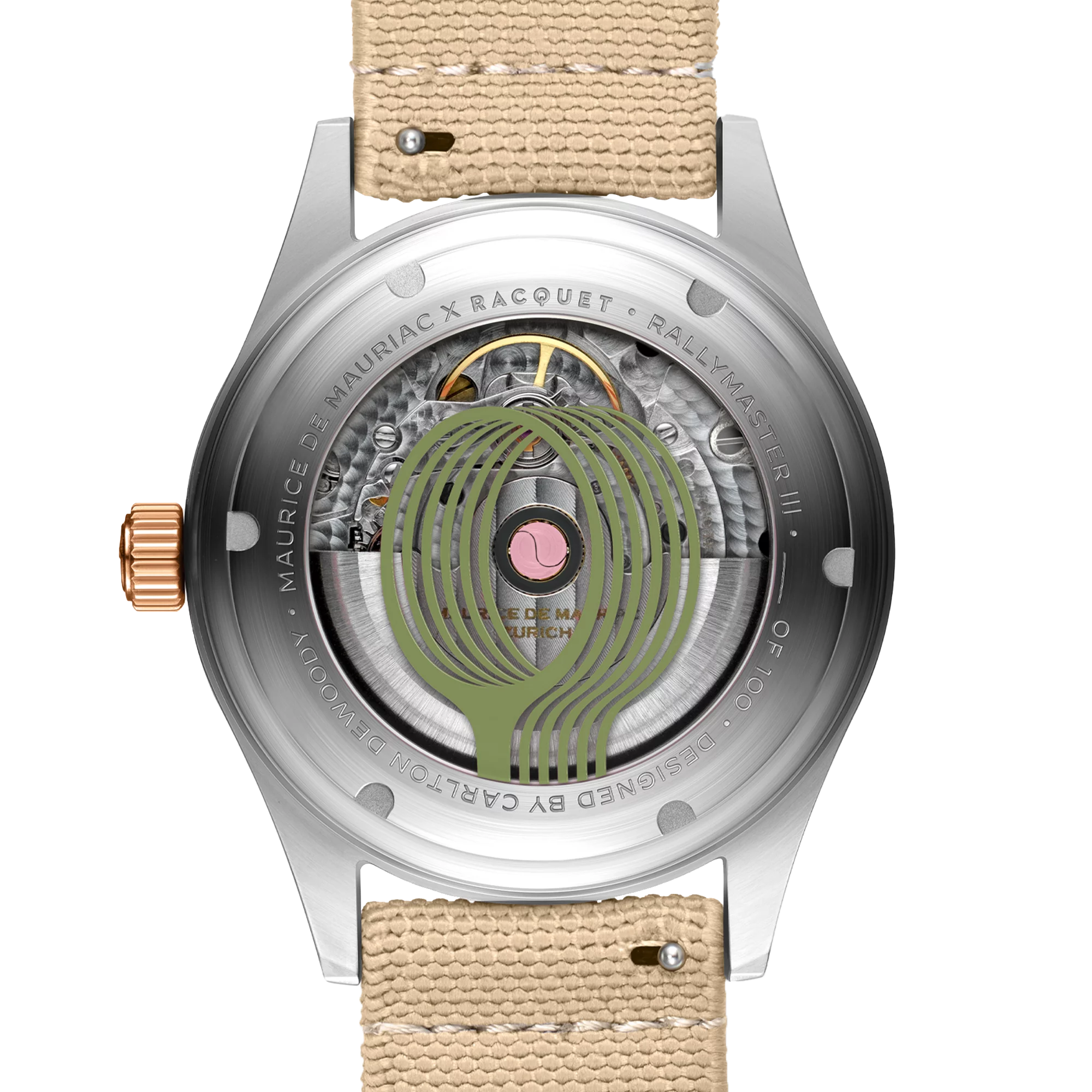Das Design der Uhr stammt von Carlton DeWoody, einem Designer, der vor allem für seine Innenarchitektur bekannt ist, und ist von den einzigartigen grafischen Zifferblättern der 60er und 70er Jahre inspiriert. Für diese Partnerschaft schlossen sich Racquet und Maurice de Mauriac mit DeWoody zusammen, dessen Leidenschaft für den Tennissport und seine profunde Kenntnis von Vintage-Uhren ihn zu einem idealen Kooperationspartner machten.