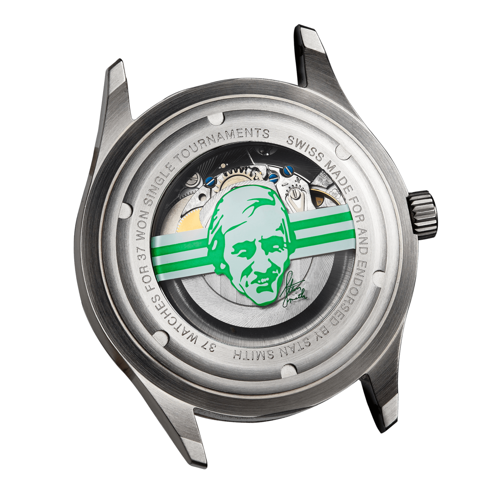 Stan Smith hat 100 Turniere im Einzel (39) und Doppel (61) gewonnen. Das ehrt unsere Uhr mit Ihrer Auflage von nur 100 Uhren pro Farbe – grün, rot, blau. Die Exklusivität könnte kaum größer, die Ehrung nicht eindrucksvoller sein. Über zwei Jahre haben Daniel, Massimo und Leonard Dreifuss mit Stan Smith an dieser Uhr gearbeitet. Sie ist das Destillat von Leidenschaft, Kompetenz, Stil und Handwerkskunst. Das große Stan Smith Buch ist mit seinen Worten “Ich bin kein Schuh“ betitelt. Klar, er ist jetzt eine mechanische Schweizer Uhr. Die Tennisuhr schlechthin, weil Sie die Legende des Tennissports so sehr in sich trägt, wie die extrem hohe Qualität, die Tennis bis zum heutigen Tag entwickelt hat.