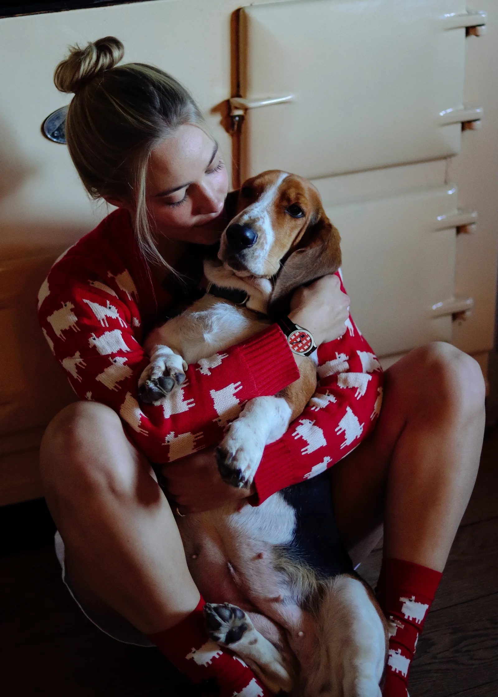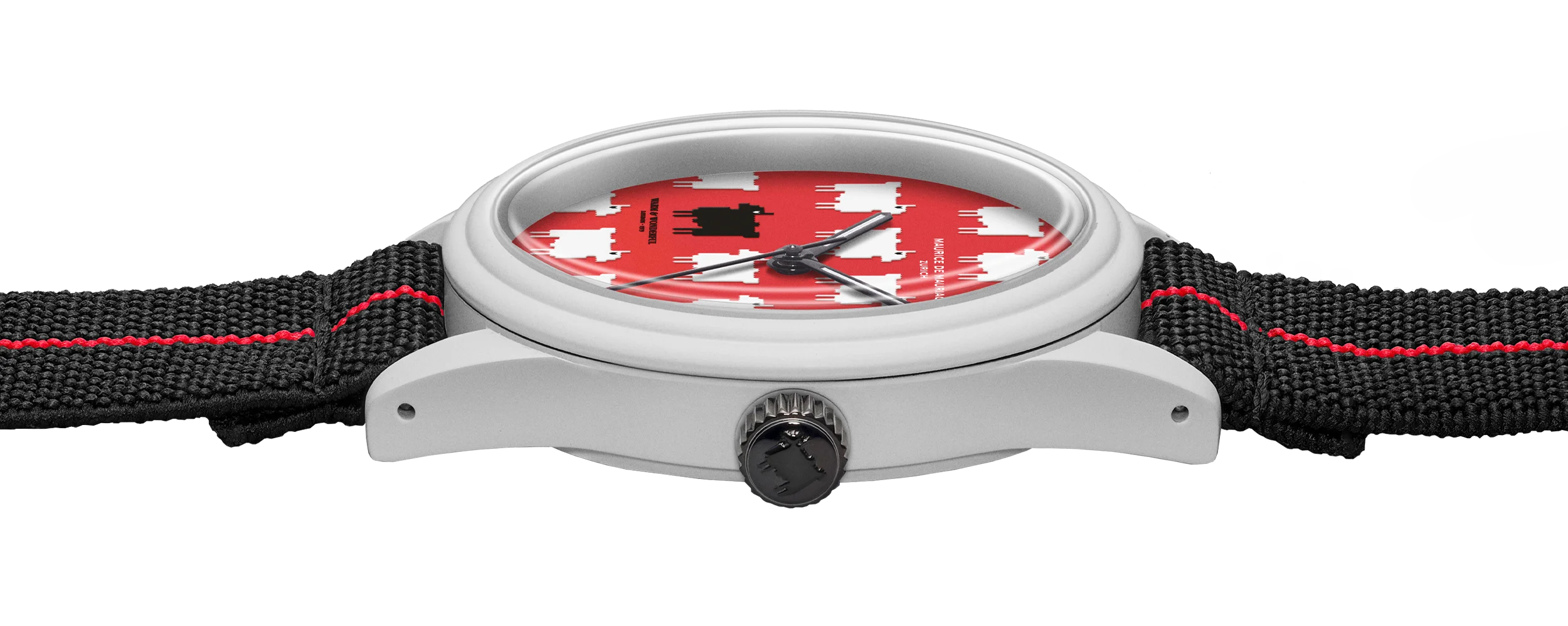 Zifferblatt: rotes Doppellogo Maurice de Mauriac + Warm & Wonderful-Zifferblatt; ein schwarzes Schaf, 15 weiße Schafe mit Swiss Super-LumiNova® SLN White X1/BL Nachleuchtmasse behandelt