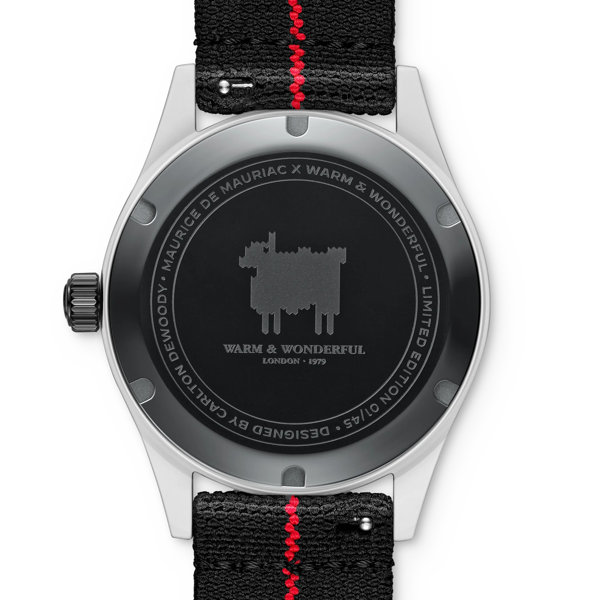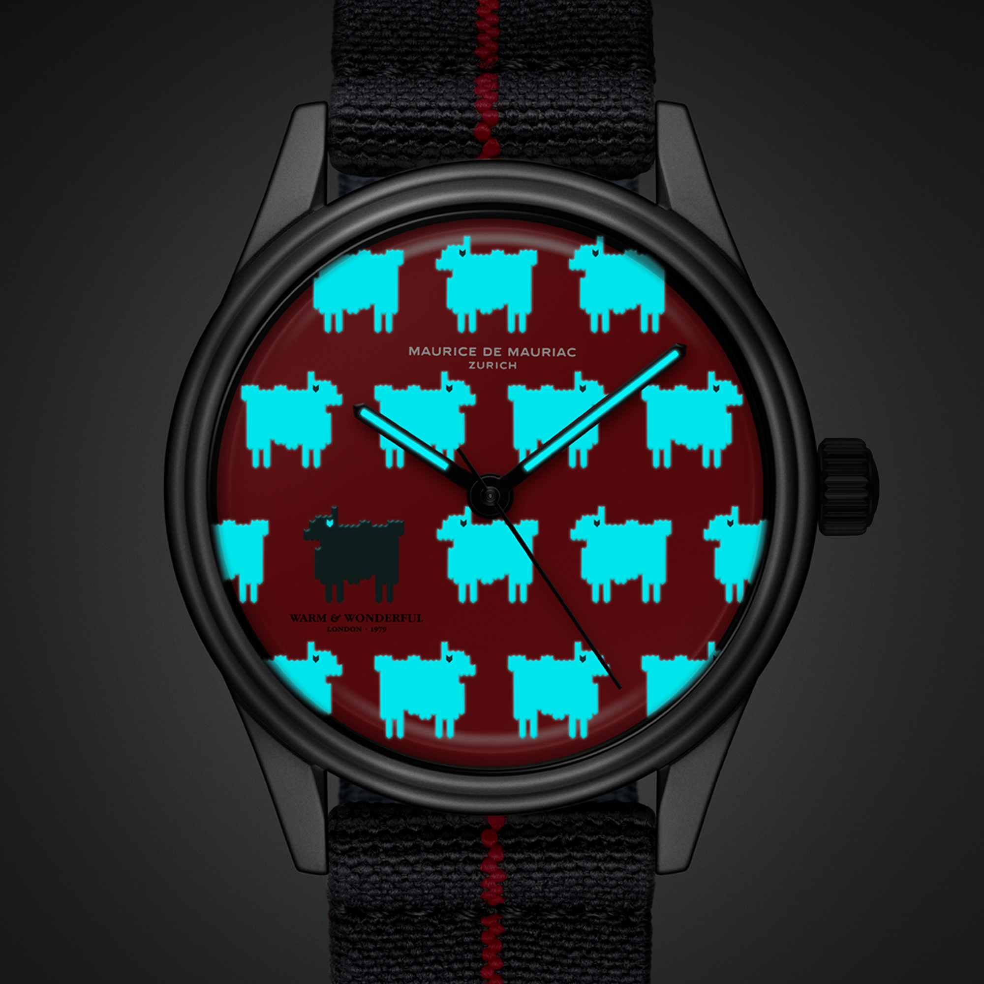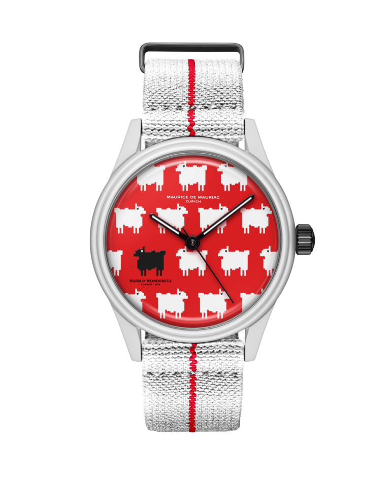 Zifferblatt: rotes Doppellogo Maurice de Mauriac + Warm & Wonderful-Zifferblatt; ein schwarzes Schaf, 15 weiße Schafe mit Swiss Super-LumiNova® SLN White X1/BL Nachleuchtmasse behandelt