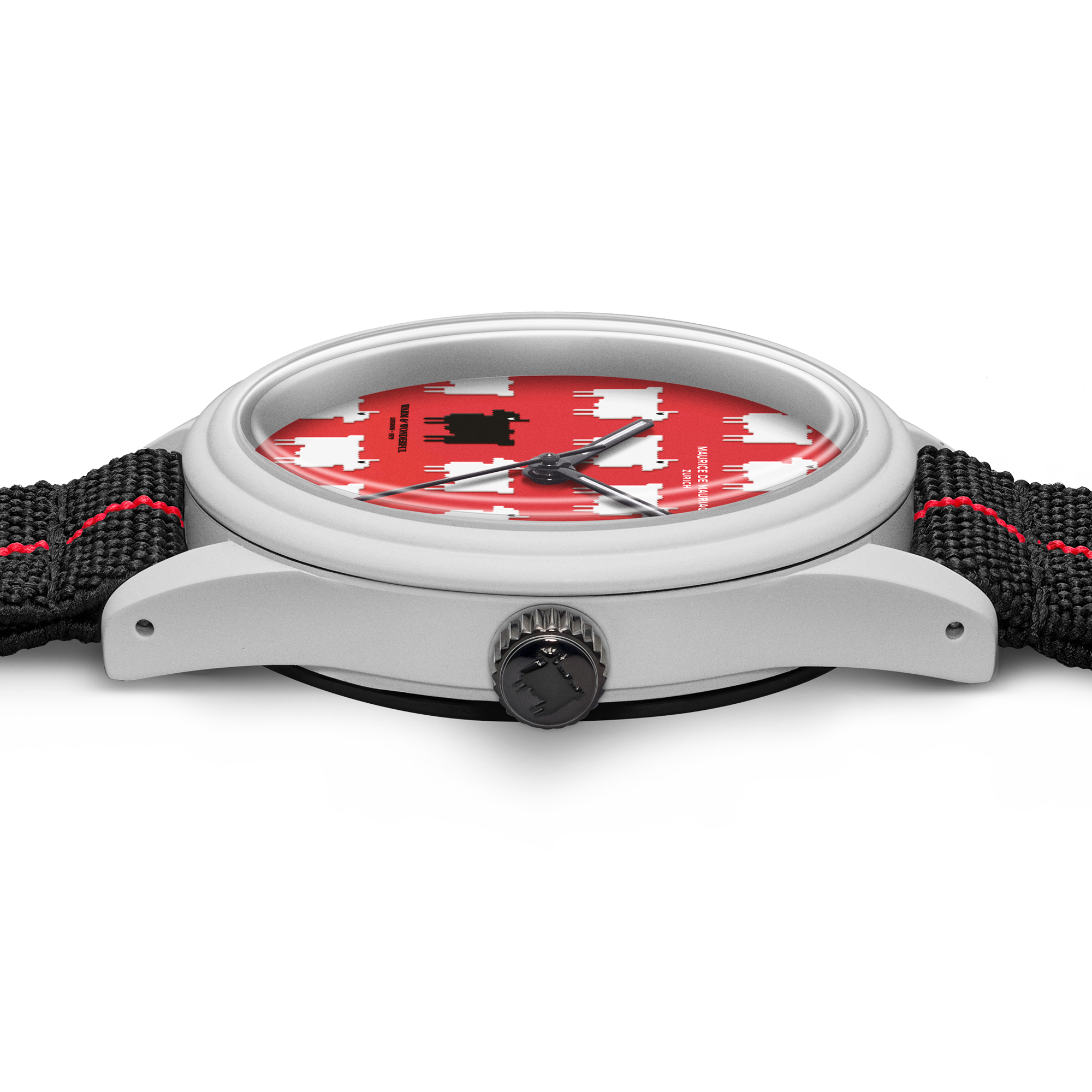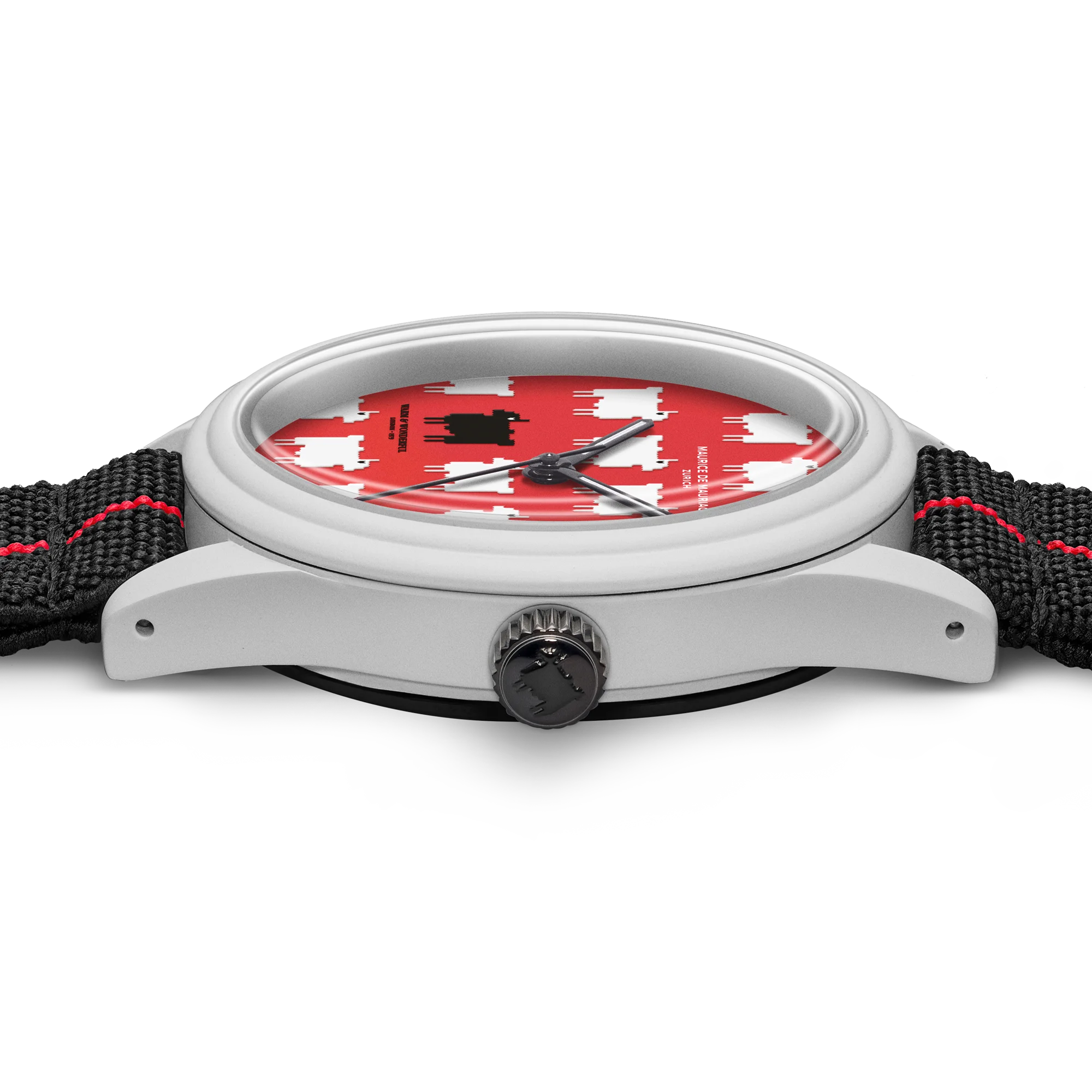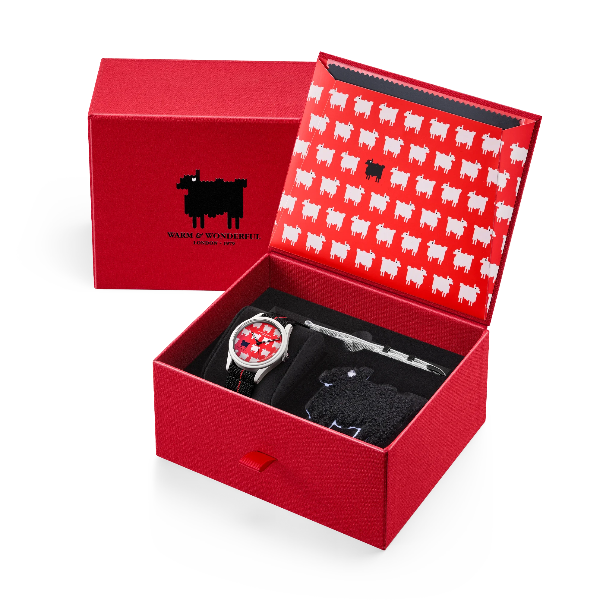 Zifferblatt: rotes Doppellogo Maurice de Mauriac + Warm & Wonderful-Zifferblatt; ein schwarzes Schaf, 15 weiße Schafe mit Swiss Super-LumiNova® SLN White X1/BL Nachleuchtmasse behandelt
