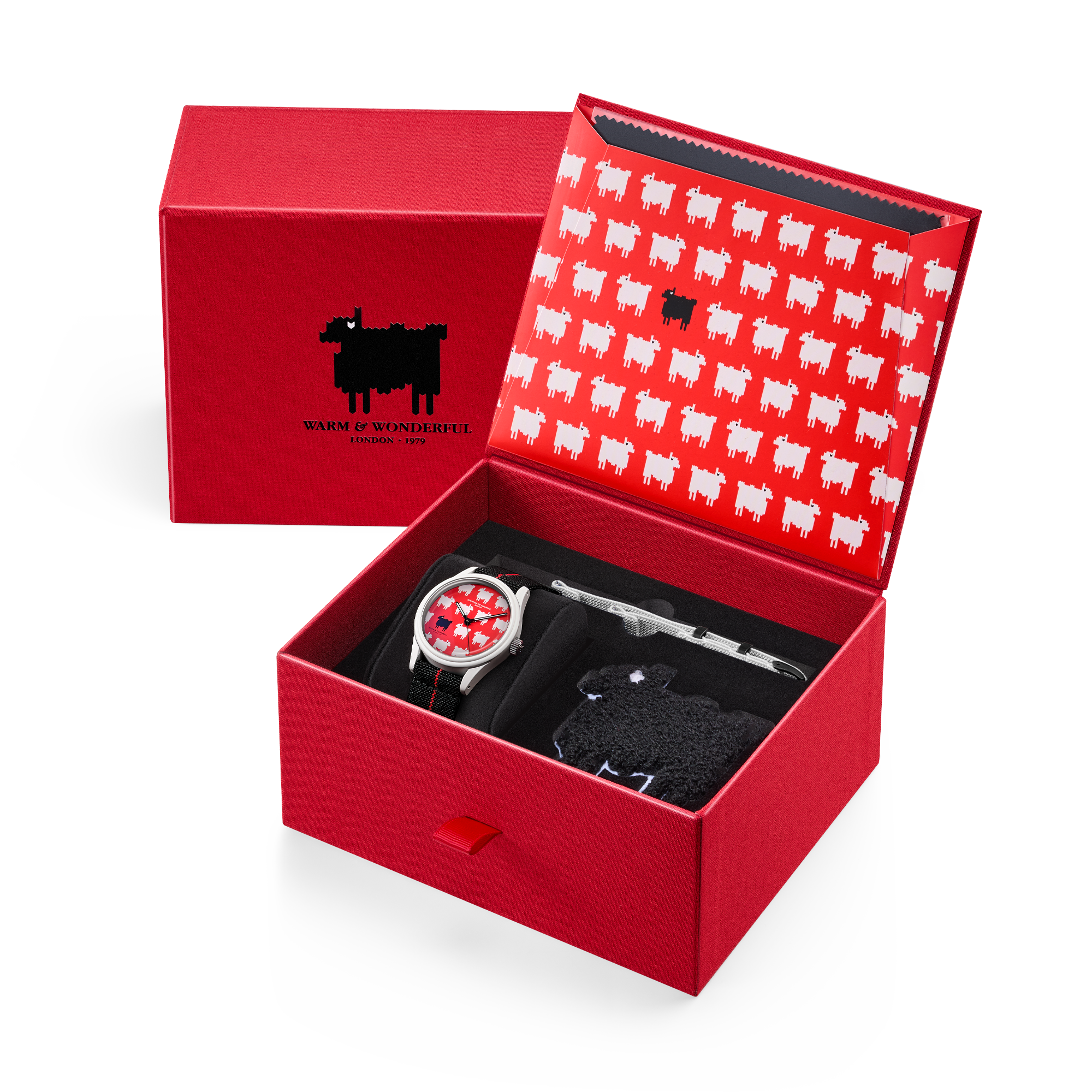 Das „Black Sheep“-Design hat nun auch Einzug in die Uhrenkultur gehalten, und zwar durch eine leuchtende Zusammenarbeit zwischen der Zürcher Uhrenmarke Maurice de Mauriac und Warm & Wonderful, um den 45. Geburtstag des ursprünglichen Strickwarenunternehmens zu feiern, das von Rowing Blazers wiederbelebt wurde.