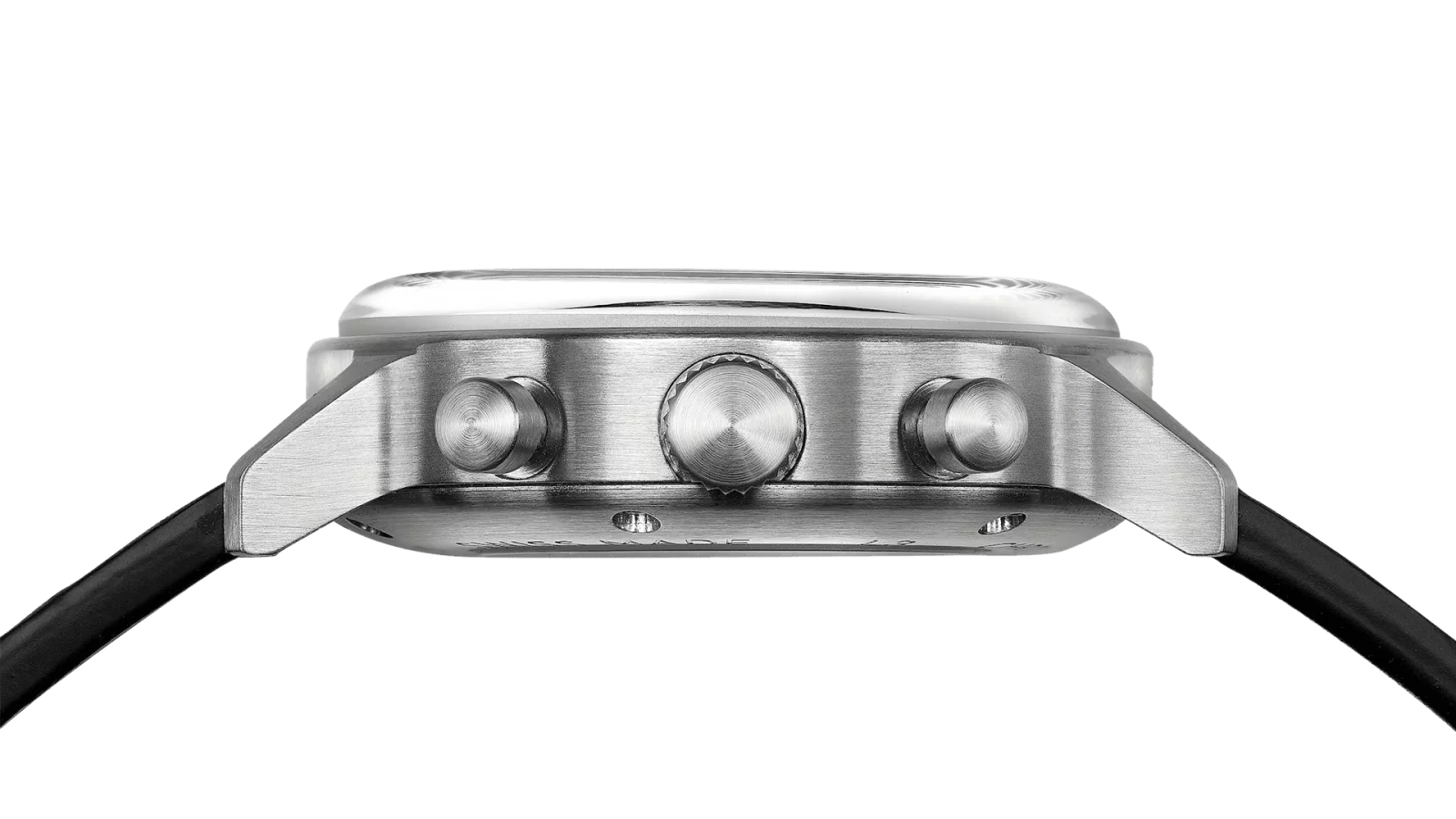 Die Zürcher Schule der Konkreten hat Schwaerzler ebenso inspiriert, wie Klassiker dieses Uhrentyps, um sich von dort in gerader Linie weiter zu entwickeln – die L(inien)-Serie zu vollenden. Sie ist eine Klasse für sich geworden und damit würdiger Teil des Uhren-Triptychons der L-Serie. Wir nennen sie eine Cuff Watch, weil sie Manschette und Anzugärmel mit geringer Gehäusehöhe und hoch gewölbtem Glas sanft streicht. Sanft streicht auch das Design des Zifferblattes das Auge. Es ist auffallend, weil es nicht auffallen will und es damit dann doch tut. Man muss die Zeit nicht lesen, weil sie sich klarer nicht zeigen kann. Die Drücker sind als solche zu erkennen und leicht zu bedienen – auch hier Klarheit und Funktion, das Sein, vor dem Schein.