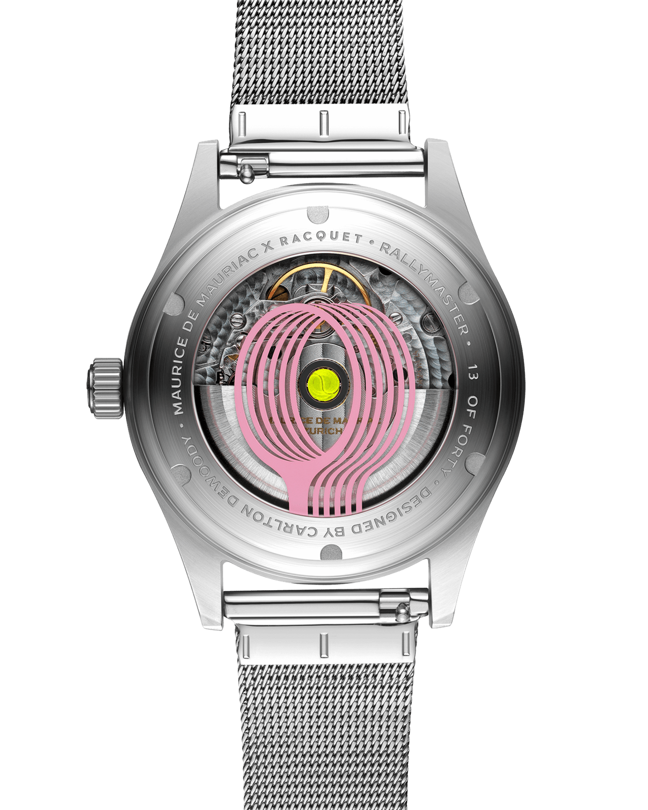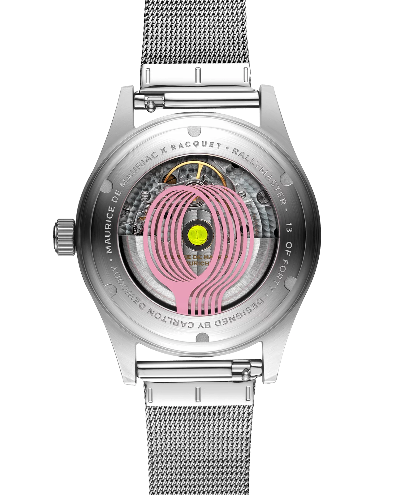 Das Design der Uhr stammt von Carlton DeWoody, einem Designer, der vor allem für seine Innenarchitektur bekannt ist, und ist von den einzigartigen grafischen Zifferblättern der 60er und 70er Jahre inspiriert. Für diese erstmalige Partnerschaft schlossen sich Racquet und Maurice de Mauriac mit DeWoody zusammen, dessen Leidenschaft für den Tennissport und seine profunde Kenntnis von Vintage-Uhren ihn zu einem idealen Kooperationspartner machten.