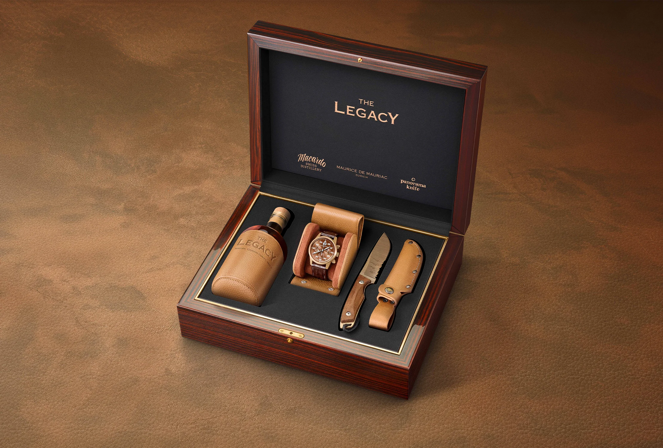 Ein Waldmesser von Panorama Knife, mit einer Bergsilhouette auf der Klinge, ein Whisky von Macardo, der der Natur aufwändig entrungen wurde und eine mechanische Uhr aus archaischer Bonze. Alles in einer fein gearbeiteten Box – „the Legacy“.
