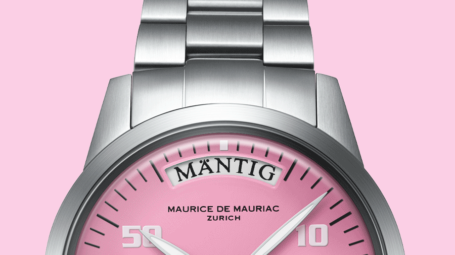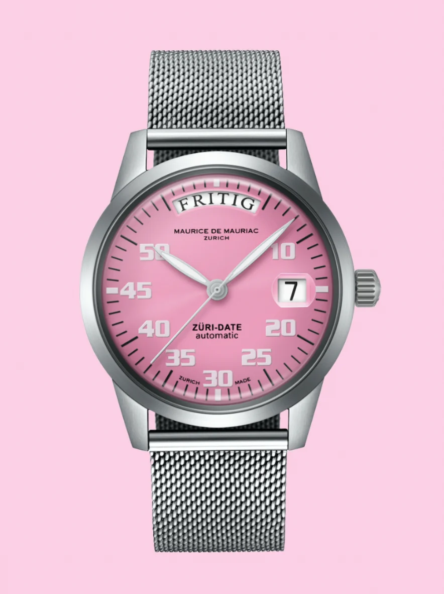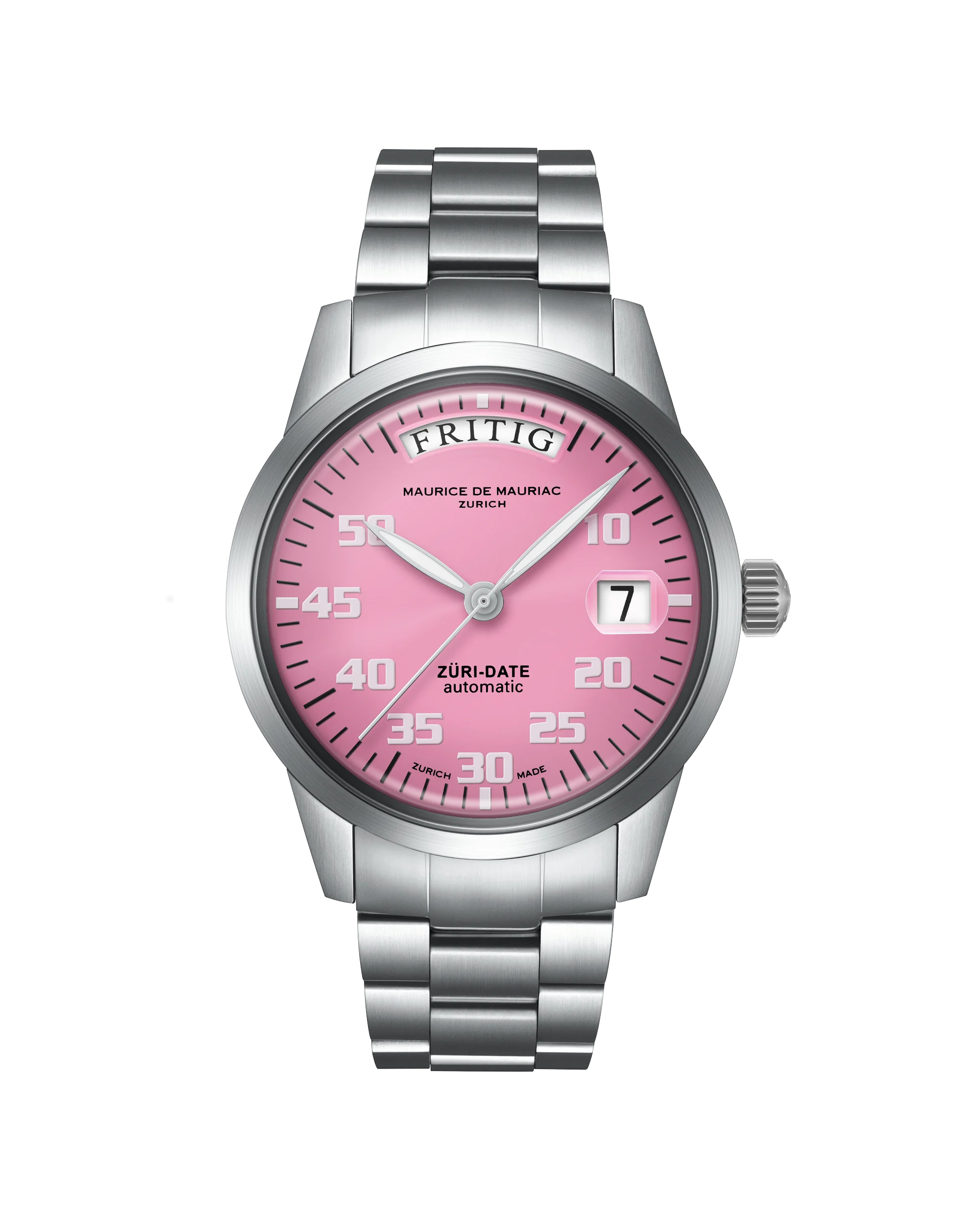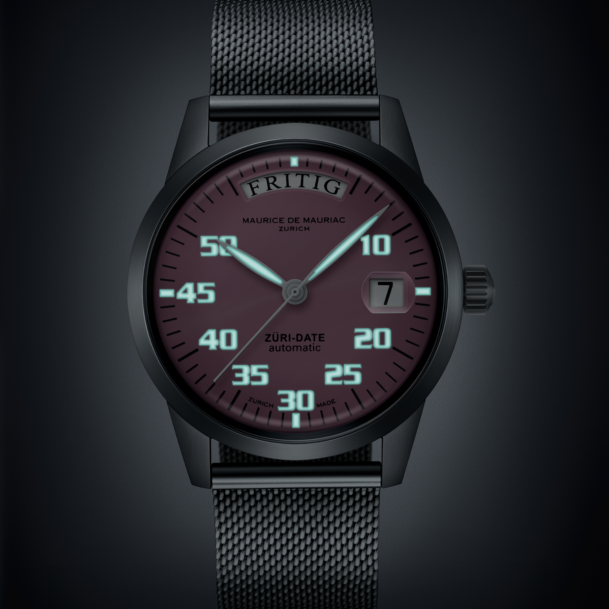 Die Züri-Date gibt es an hochwertigem Lederband, Milanese oder mit Stahlband. Das Zifferblatt ist geprägt von der Tagesanzeige bei 12 Uhr in Zürcher Schweizerdeutsch und einer Lupe auf dem Datum bei 3 Uhr. Das Werk, natürlich ein Automatikwerk, ist ein verziertes ETA 2834-2 Werk mit 25 Juwelen. Der Glasboden gibt die Sicht auf das Werk frei, sodass man zusehen kann, wie schön die Zeit in Zürich vergeht.